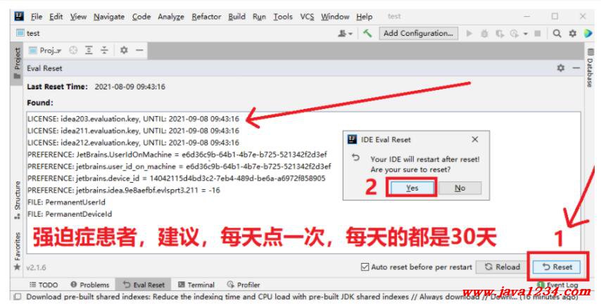 鎸夐挳錛?Reset 鐐瑰嚮浼?xì)璇㈤棶鏄惁閲嵕|瘯鐢?0澶╁茍閲嶅惎IDE銆傞€夋嫨 Yes 鍒欐墽琛岄噸緗搷浣滃茍閲嶅惎IDE鐢熸晥錛岄€?/span>